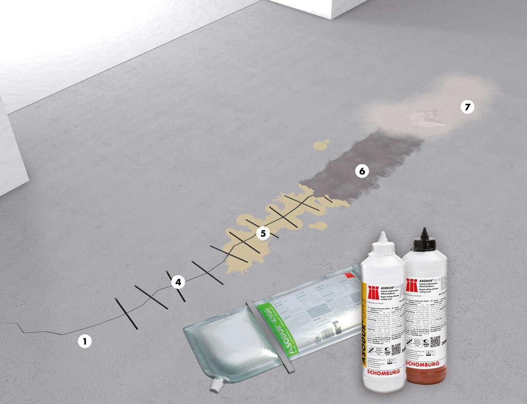 With narrow cracks up to a width of 0.4 mm, use the fluid epoxy resin, ASODUR-K900.